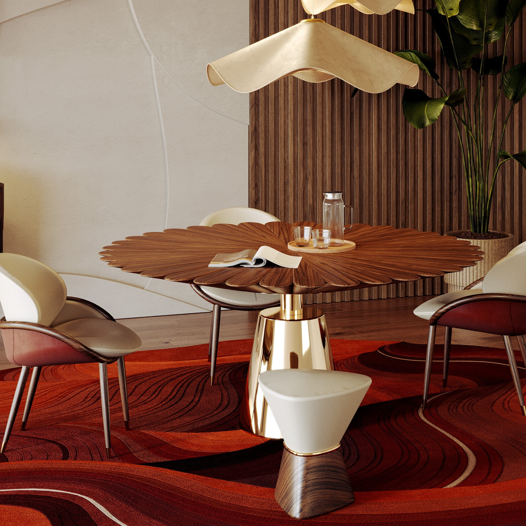 Balanced contrast: mixing distinct colours, shapes, or materials so that each element complements the other without overpowering. For example, a colourful rug like ALMA de LUCE's Antelope Canyon perfectly balances a piece of furniture, such as the Bonsai dining table with its White Estremoz marble top, creating interest without losing cohesion.