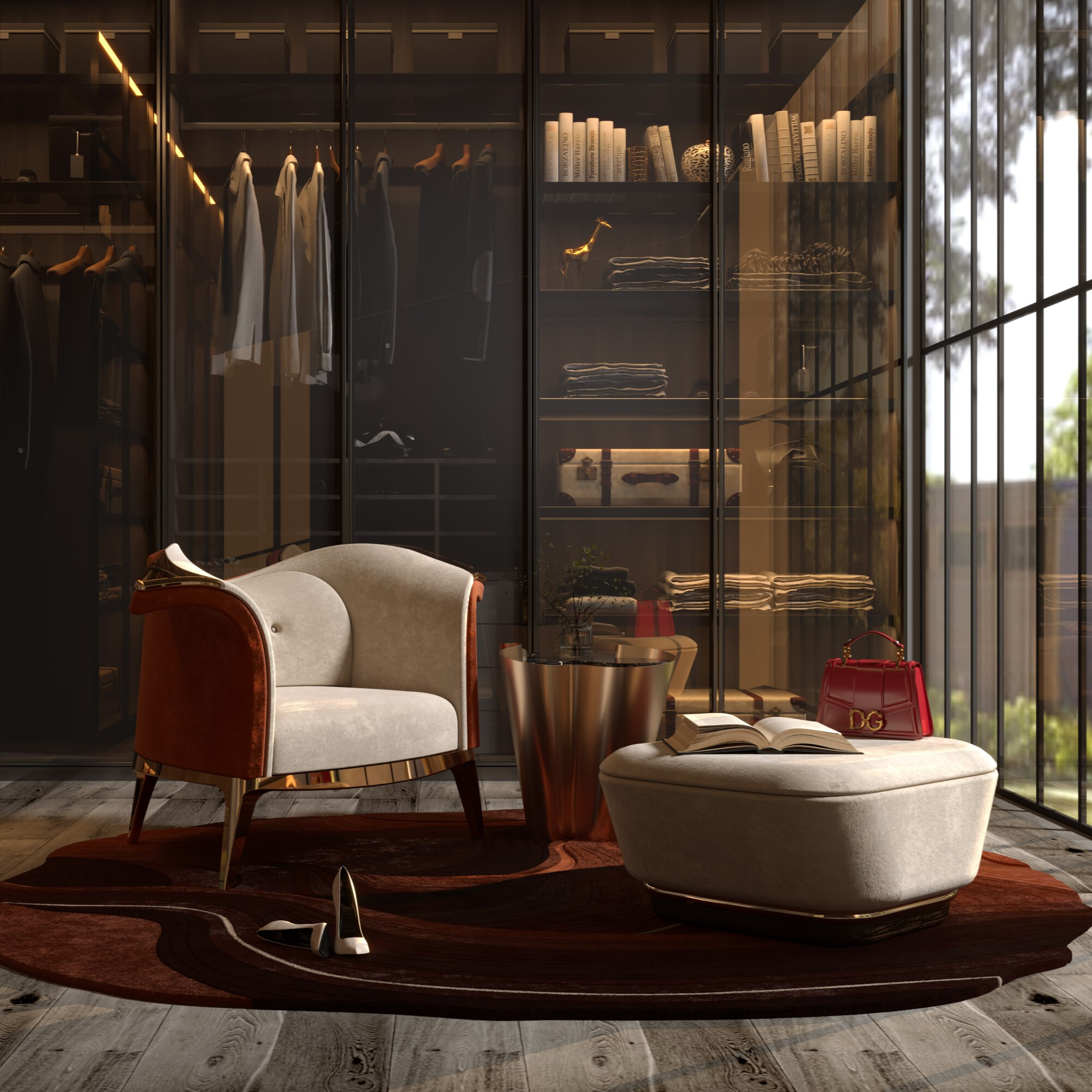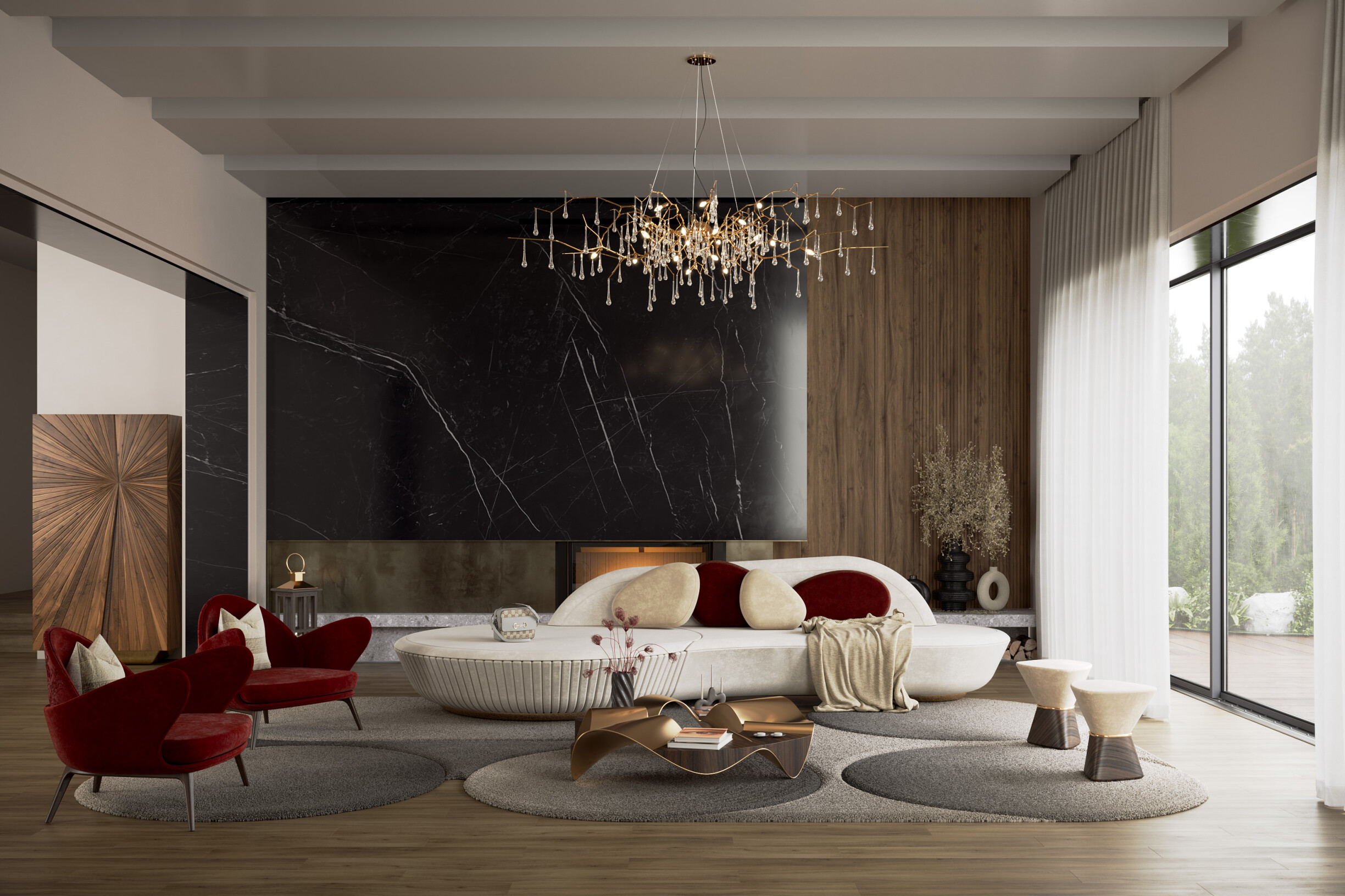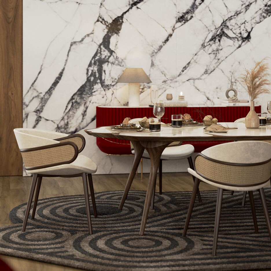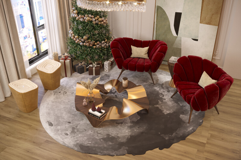 In winter design projects, light helps structure social spaces without making them rigid. A rug like the Marqueyssac gains depth when softly illuminated, helping to anchor the living room visually. Side tables, such as the Ballet Coffee Table, become natural focal points when framed by indirect lighting, contributing to functional and user-friendly spaces designed for comfortable and fluid entertaining.