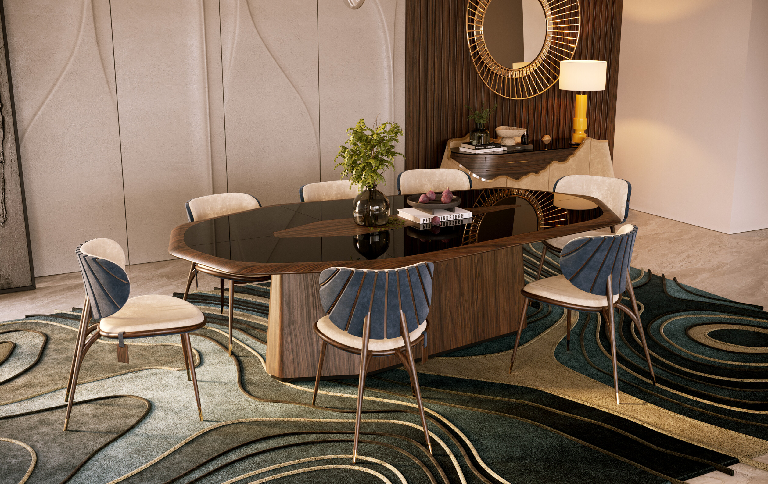 The Dom Sebastião Sideboard particularly benefits from grazing lighting, which highlights the texture and precision of the piece, giving it an architectural presence. The Korowai Dining Table, on the other hand, takes on an almost sculptural role when strategically illuminated, establishing itself as one of the design cabinets that define the identity of the space.