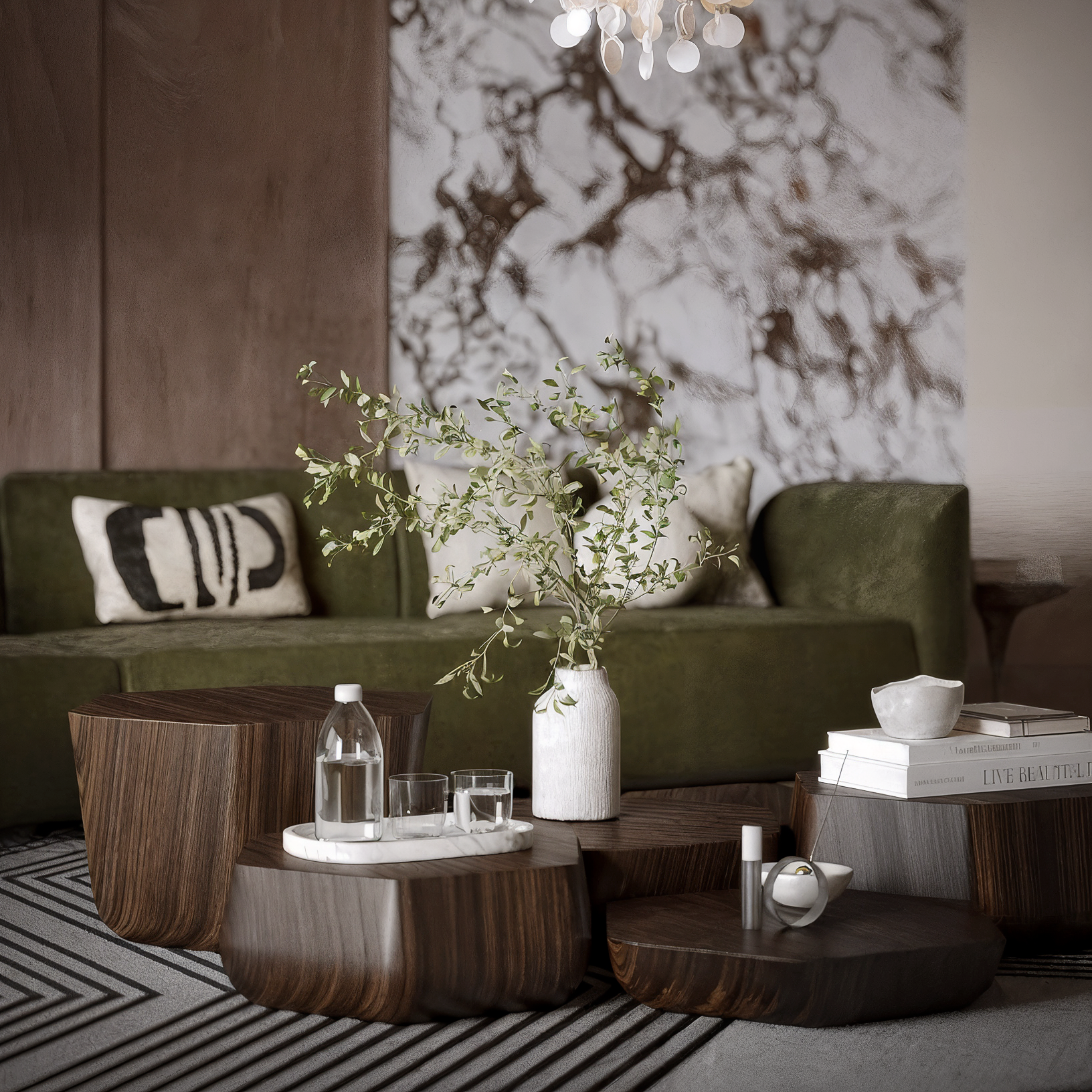 Earthy tones convey grounding, truth, and emotional security. They create immersive and welcoming spaces, associated with permanence and identity. They are particularly effective in projects that explore sculptural design and value the dialogue between symmetry and asymmetry in interior design. These colours reinforce the power of storytelling by connecting the space with cultural and ancestral references.