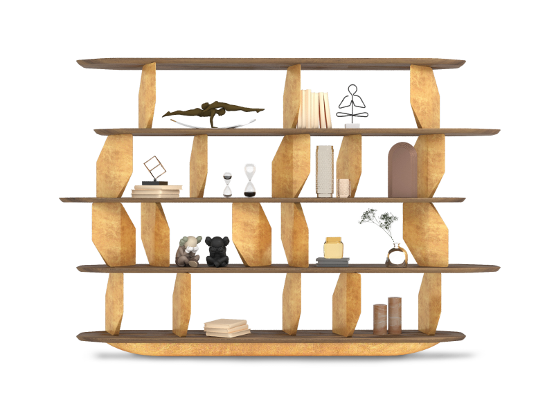 Shelves in solid walnut wood & veneer with matt finish. Shelf divider in gold leaf with gloss