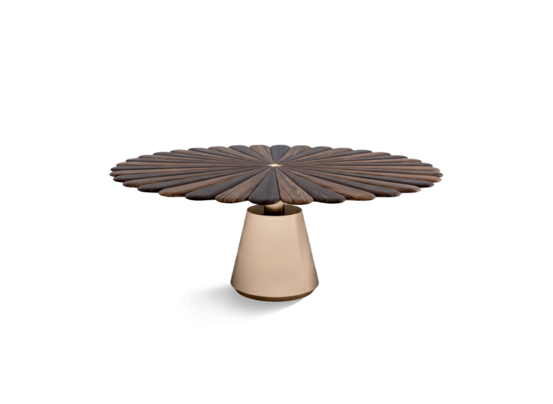 Handcrafted in luxurious walnut wood, the Goathi Dining Table boasts an impressive round design, elevated by a striking brass-finished base. The table celebrates both the art of design and the mastery of traditional woodworking, resulting in a piece that is as functional as it is breathtaking. The brass-finished foot provides structural support and a luxury contrast to the natural warmth of the walnut top, creating a sophisticated balance of materials.